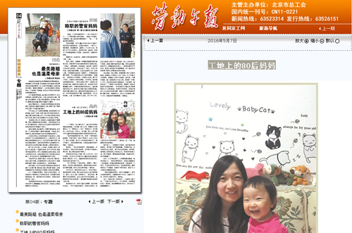 本网讯 《劳动午报》5月7日刊发“工地上的80后妈妈”讲述中建一局二公司中国少年儿童科技培训基地项目技术员高冉的故事,全文及链接地址如下:http://ldwb.workerbj.cn/content/2016-05/07/content_30997.htm