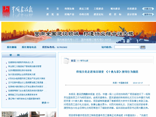 本网讯 《中国建设报》刊发二公司新闻“传统文化走进项目课堂 《十典九章》演绎行为规范”全文及链接地址如下:https://jcms.cscec.com/jcms/oawindow/main.jsp